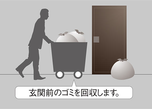 週2回、可燃ゴミのゴミ袋を各住戸の玄関前に出しておけば、管理員がゴミを回収。屋外のゴミ置場までゴミ出しに行く手間も省けます。